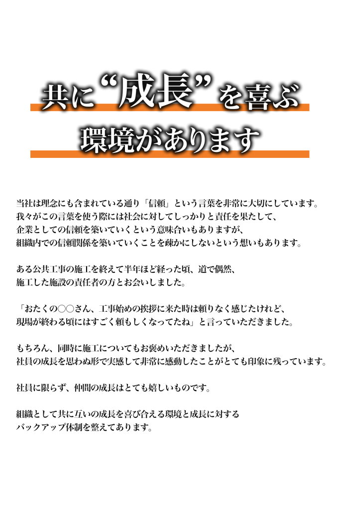 組織として共に互いの成長を喜び合える環境と成長に対するバックアップ体制を整えてあります。